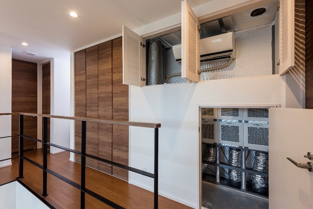 イデキョウホームの全館空調は、高品質で効率的なシステムを提供します。上述のマッハシステムでは市販のエアコンやダクト製品等も既製品を応用しているため、専用の全館空調システムに比べ中長期に渡りメンテナンスがしやすく、メンテナンスコストも少ない点が特徴です。通常の全館空調システムではエアコンなどの設備が故障した際、システムまるごと取り換えが必要になり、メンテナンスに莫大な費用がかかるということも珍しくありません。ですがイデキョウホームのマッハシステム全館空調であれば、市販のエアコン1~2台を空調ユニットに設置するだけなので、エアコンが壊れたら取り換えるだけで済ませることができます。これまでの施工実績から設計の段階でそうしたメンテナンスについても考慮することで将来的なコストを抑えることができます。