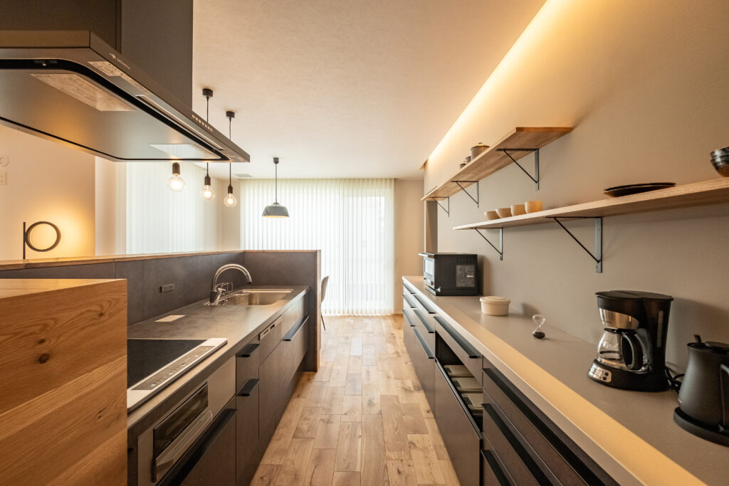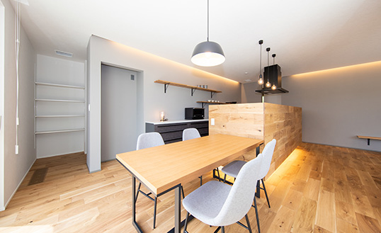 キッチンの周りに壁がないため、家事をしながらコミュニケーションが取りやすく、家族との繋がりが持てます。また、大勢でキッチンの周りを囲んで、会話をしながら一緒に調理することもできます。頭上に吊戸棚がないため、開放感抜群です!