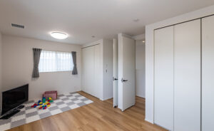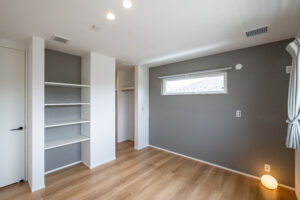 水回り空間を西側に直線配置することでシンプルな家事導線をつくり家事の効率化を意識した間取りに。脱衣室と洗面所を分け、広くとった洗面室は、ランドリールームとしても使用でき、洗濯効率がアップします。イデキョウホームの全館空調は、大風量小温度差なので、乾きもいいのがポイントです!