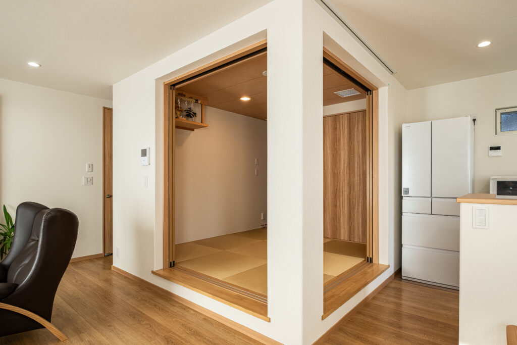 広いリビングと、お仏壇を祀るための小上がり和室です。本家としてふさわしい空間をつくりたいという希望が形になりました。外観も和の雰囲気にこだわって、屋根は軽量瓦で軽量化も実現しました。また「広い庭が欲しい」という希望も叶えられ、満足しています。