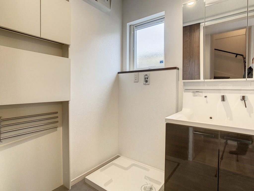 洗面所・脱衣室の限りあるスペースに、壁埋め込み収納を設けました。タオル掛けが付いているので、物干しに使用したり、中段は扉を手前に倒すことでゆったりとした棚になり、簡易的な作業台として使用もできます。