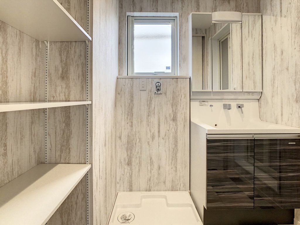 洗面台の木目調の扉に合わせてホワイトウッド調を壁紙に使用しました。