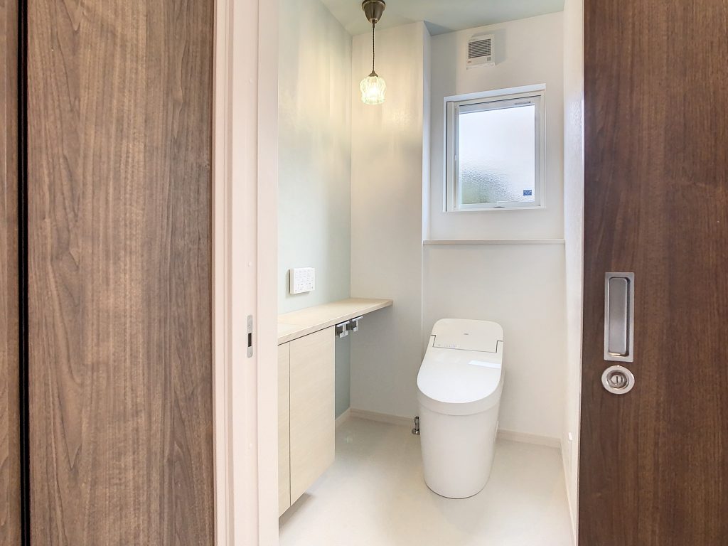 将来のことを考え十分な広さを確保。手摺代わりにもなるカウンターを設置し、今は飾棚として使用し、将来的には手摺としても使えます。また、タンクレストイレにすることによってスッキリとし、掃除もしやすく清潔に!
