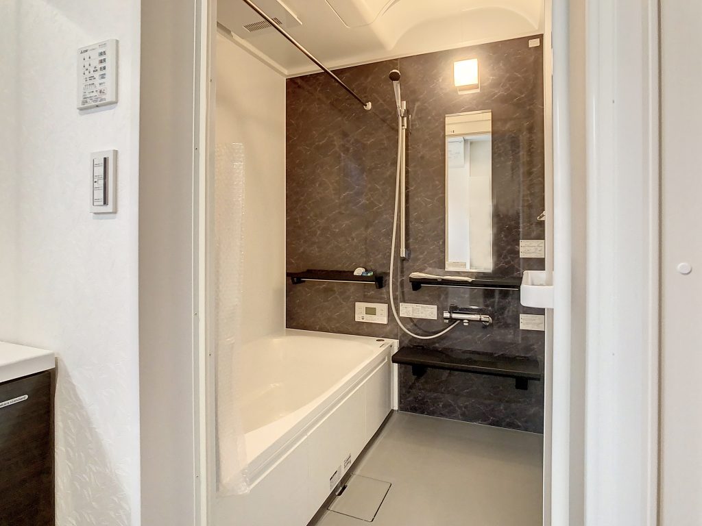 家族みんなで使用するあたたかさが続く浴室は、お洒落なアクセントパネルとフレキシブルなカウンター兼収納で快適なバスタイムに!