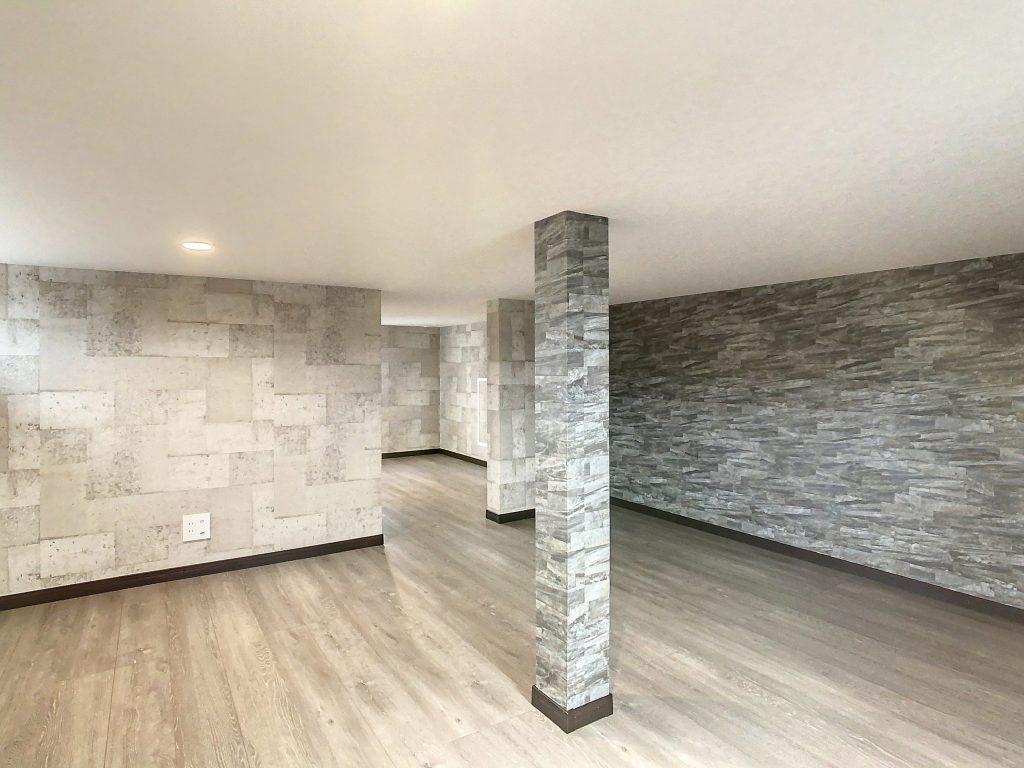 コンクリート柄のクロスがかっこいい小屋裏収納。 階段で上り下りできるので、荷物の出し入れが楽々。収納のほか、お子様の遊び場としても活躍します。
