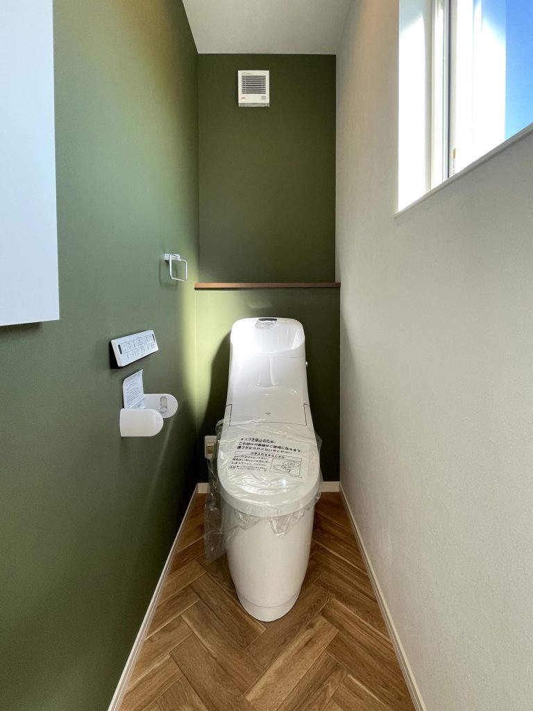 フォレストグリーンの壁紙とヘリンボーンの床がマッチしてます