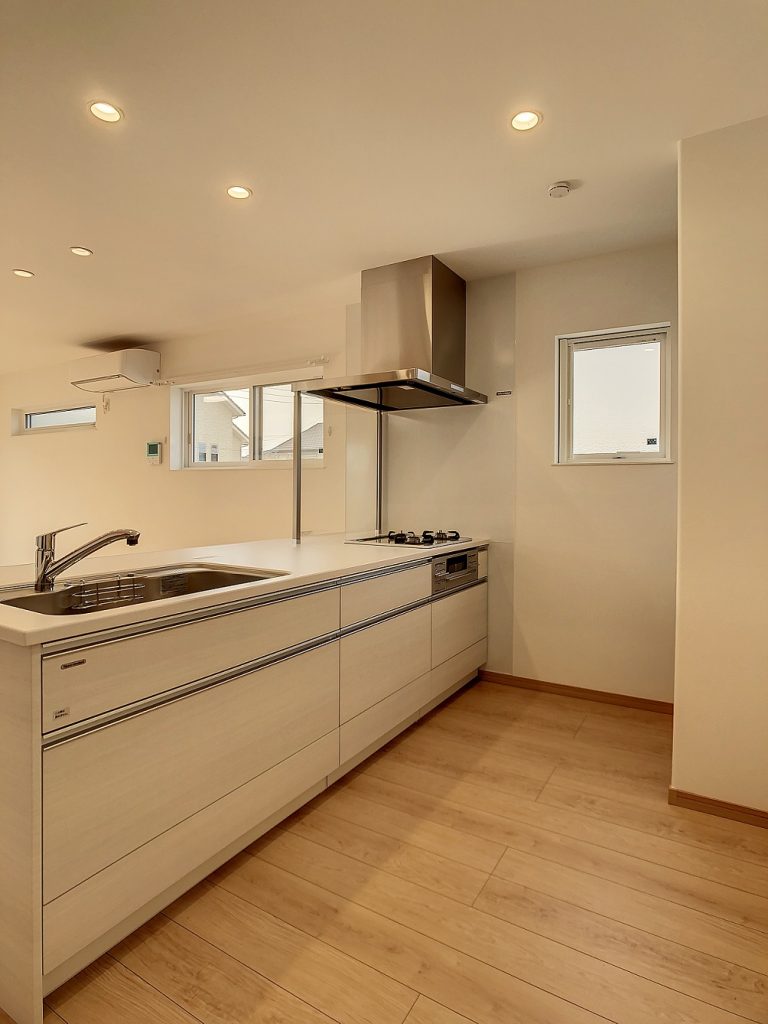 家事動線を意識した奥様リクエストのキッチンと隣接した洗面脱衣室