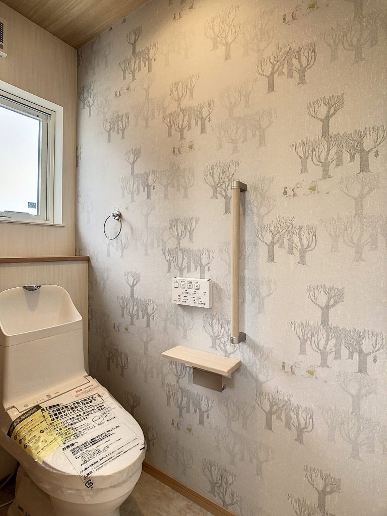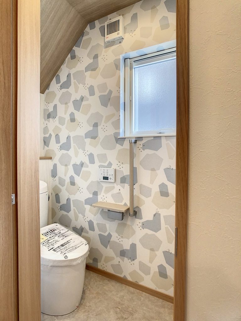 2階トイレにも柄物クロスを使用し、雰囲気の違う印象に