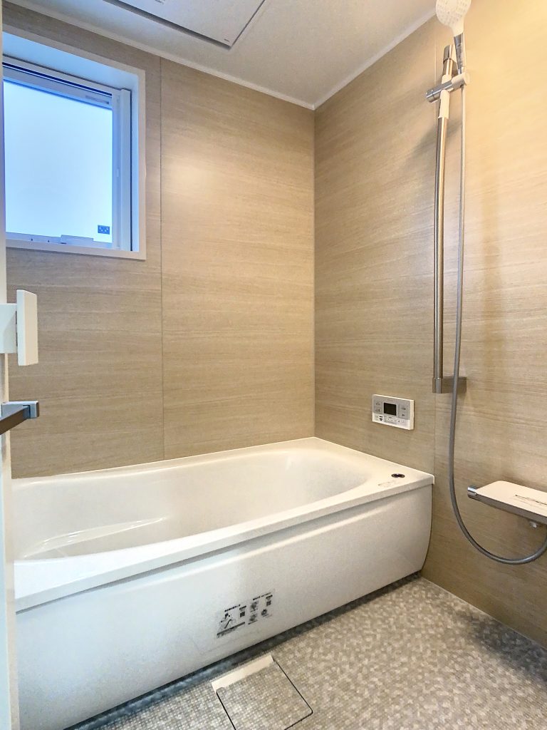ナチュラルな雰囲気の木目調の浴室は、温かみのある落ち着いた印象を与えます。ラウンド浴槽を採用し、ゆったりと寛げる形状で身体を預けやすくなっています。