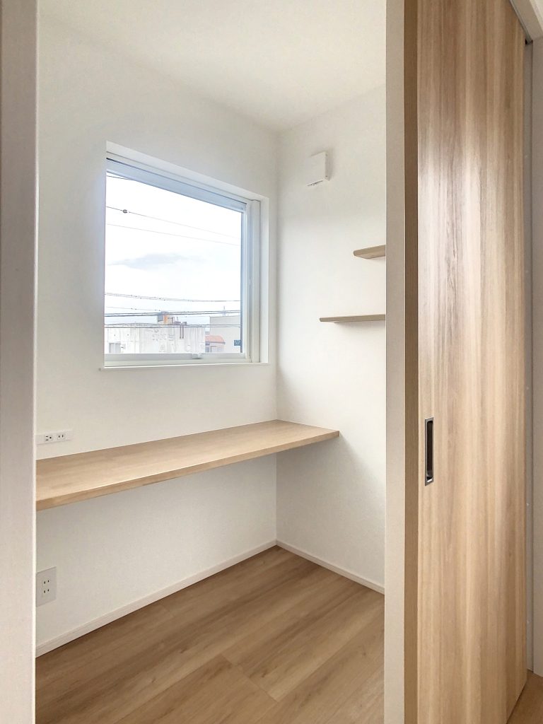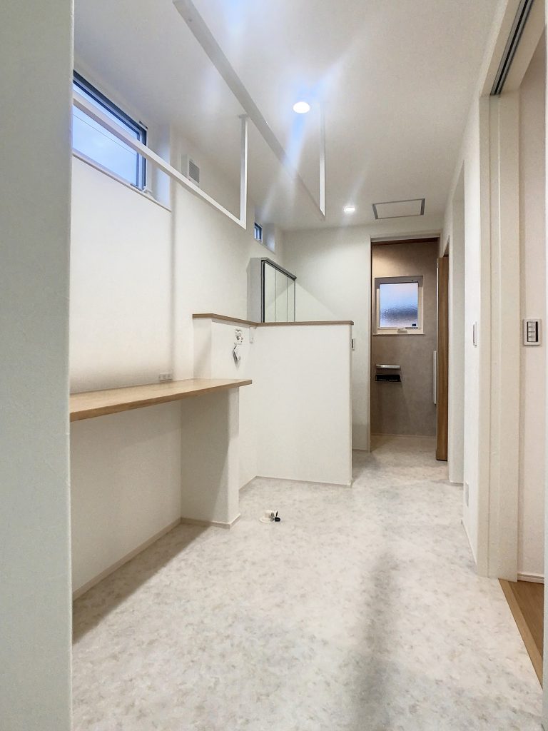 玄関からトイレ、洗面、洗濯機、物干しスペース、脱衣室、そしてお風呂と水廻りの動線を一直線にまとめた回遊動線は、家事や身支度がしやすく、ショートカット(近道)もできるなど、暮らしやすい間取りになっています。