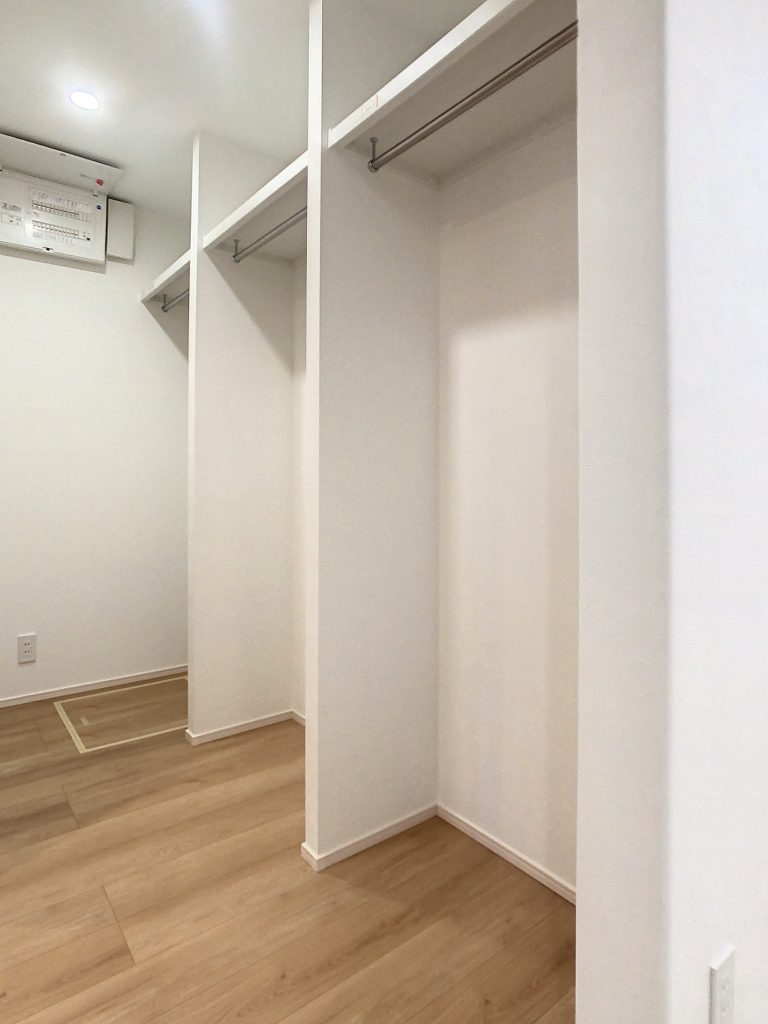 玄関ホールから直接アクセスできるウォークスルーのファミリークローゼット(2.2帖)は洗面室にも隣接しているため、洗う・干す・しまうが1か所で完結できます。