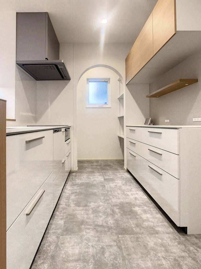 ムダな装飾のないホワイトキッチンは、上品で大人っぽい素敵な空間に。キッチン奥にはパントリーを設け、開口部分をアーチ状にし、空間をゆるやかに区切っています。