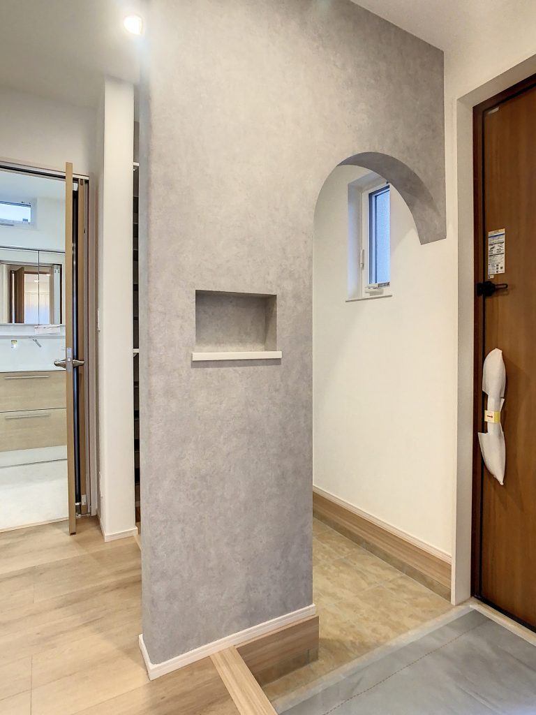 ウォークスルークロークの入口は、優しい雰囲気のアーチ型になっています。壁面にはニッチが採用され、玄関をおしゃれに演出してくれます。
