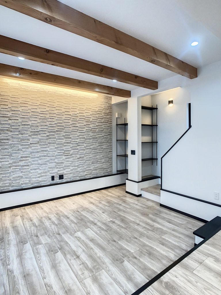 梁出しの天井とフロアを下げて高低差を持たせたダウンフロアにより、空間に緩やかなメリハリが生まれ、洗練されたリビングスペースが実現しました。