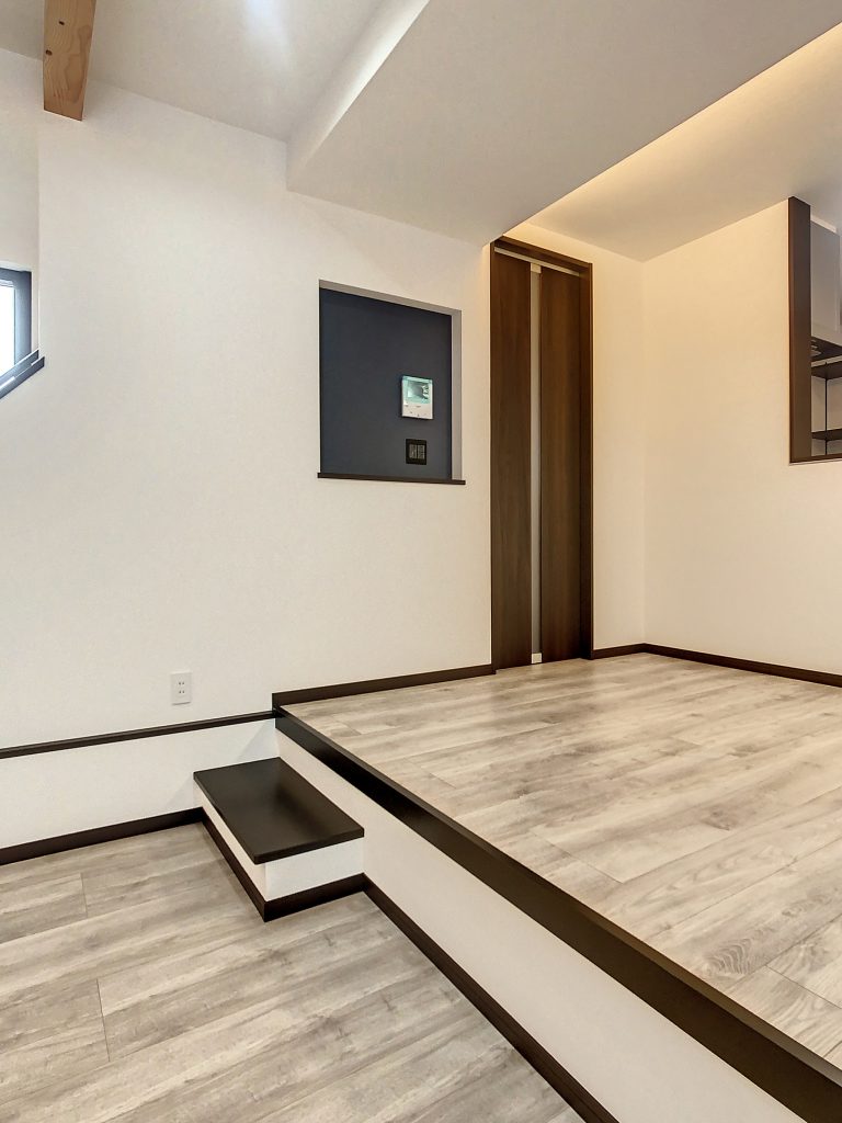 和モダンを意識したダイニングに隣接した和室では、和のテイストを強調しすぎないように、畳をシックなチャコールグレーに仕上げました。