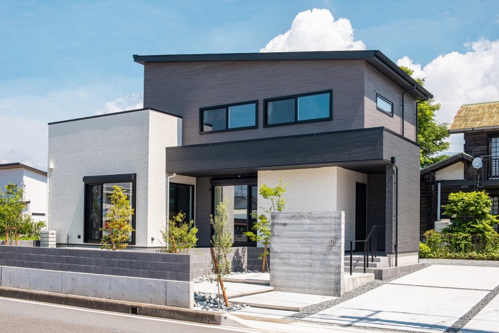 水平ラインを強調した伸びやかな外観デザインは、エアコンの室外機がないのも美しい!1階の共有スペースを広くして、2階のプライベート空間をコンパクトにすることで屋上庭園が生まれました!!