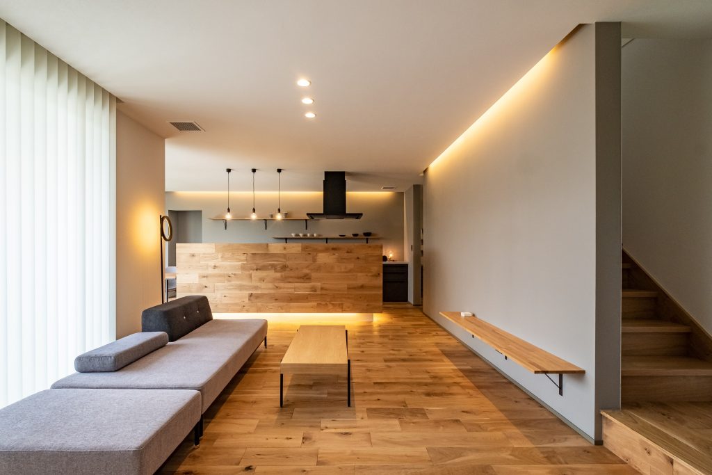 アイランドキッチンを起点とした22畳あるLDK。モデルハウス終了後に居住する方のために、白・木目・グレーといったシンプルな色でコーディネートしました。