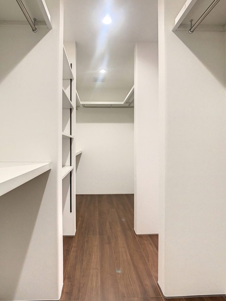 寝室には、たっぷり収納できるウォークインクローゼットを設置しました。可動棚を備えたスペースには、バッグや小物を整理することができます。さらに、ハンガーパイプと枕棚も取り付けてあります。お手持ちの収納ケースなども収納できる広さなので、居室を有効活用できるのもポイントです!