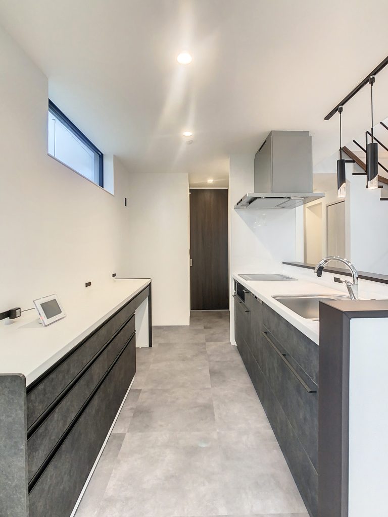 アイランドキッチンをメインとして採用し、配置にもこだわりました。キッチンからパントリー、その奥には洗面脱衣室へとつながり、さらに浴室へとスムーズな時短動線を確保しています。