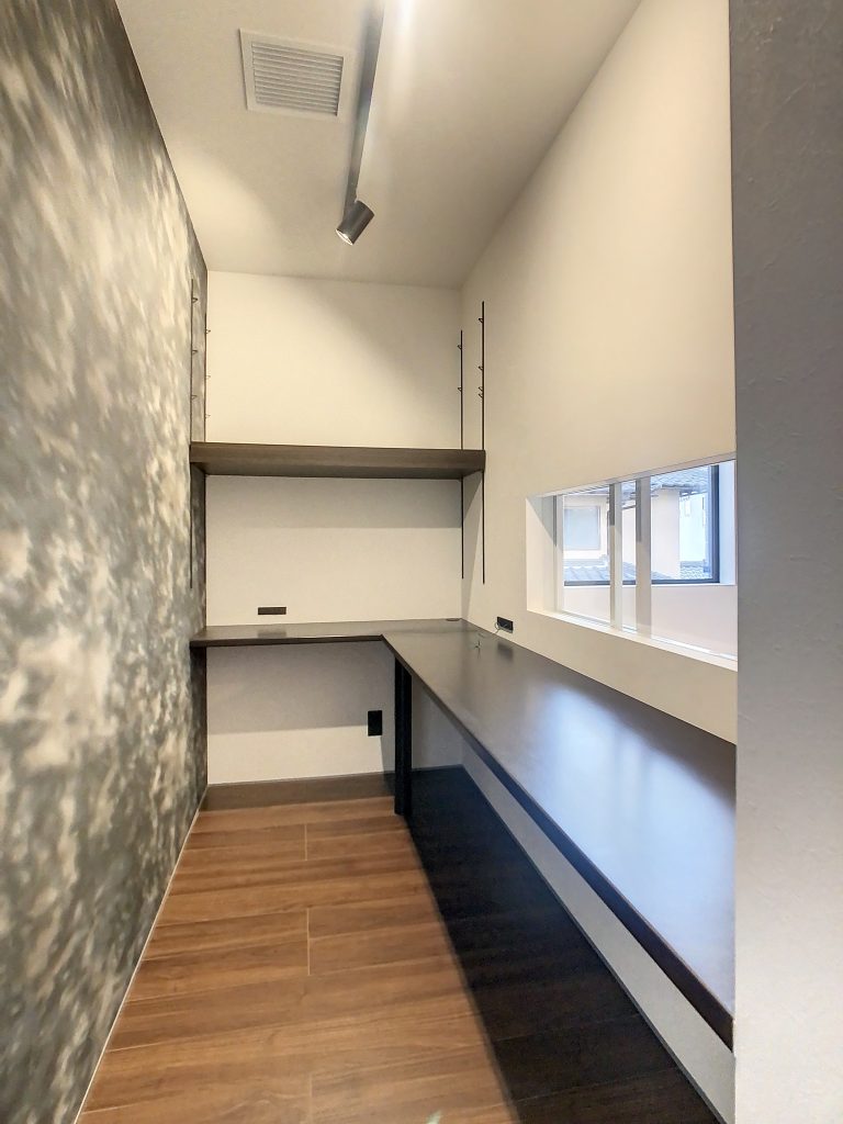 趣味部屋として、リモートワークスペースとして、クローズでありながら吹き抜けを通してリビングの家族とも繋がる寝室の一角に設けた書斎。
