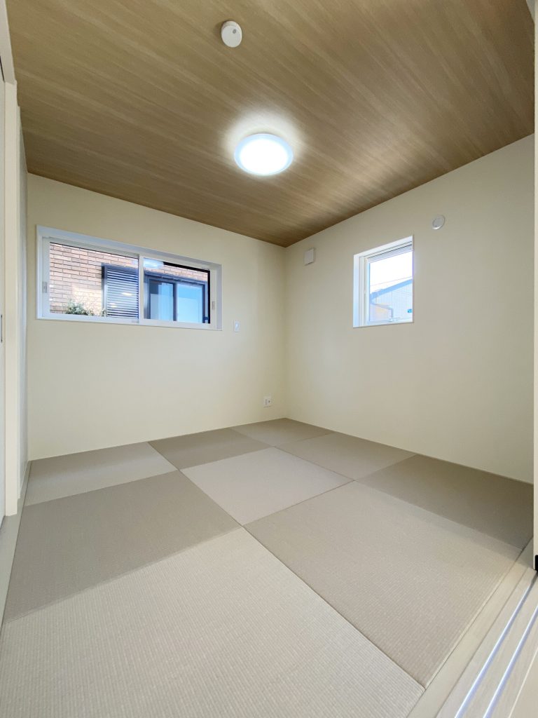リビングに続く和室は、リビングの雰囲気になじむように、縁なし畳と大壁のクロス仕上げでシンプルにデザインされています。お子様のお昼寝中も目が届き、安心です。将来的には寝室として利用することも可能です。