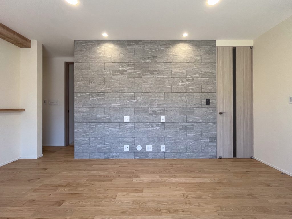 テレビボードの背面の壁には、一面にエコカラットを採用しました。エコカラットは、インテリアとしてのアクセントだけでなく、室内の湿度調整や脱臭効果、有害物質の低減など、多くのメリットがあります。