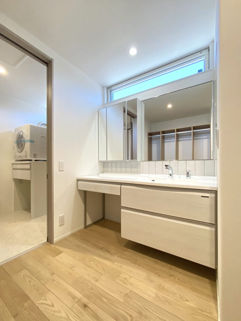 奥様ご希望のドレッサーを兼ねた大きな洗面化粧台は、2人が並んでも余裕があり、朝の順番待ちが解消できます。