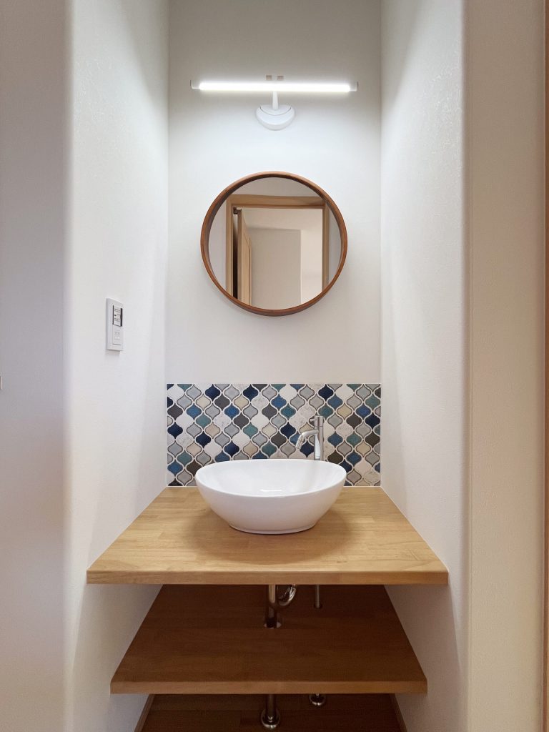 タイルがおしゃれな2階の手洗いは、丸い鏡と丸いボールが可愛らしいです。