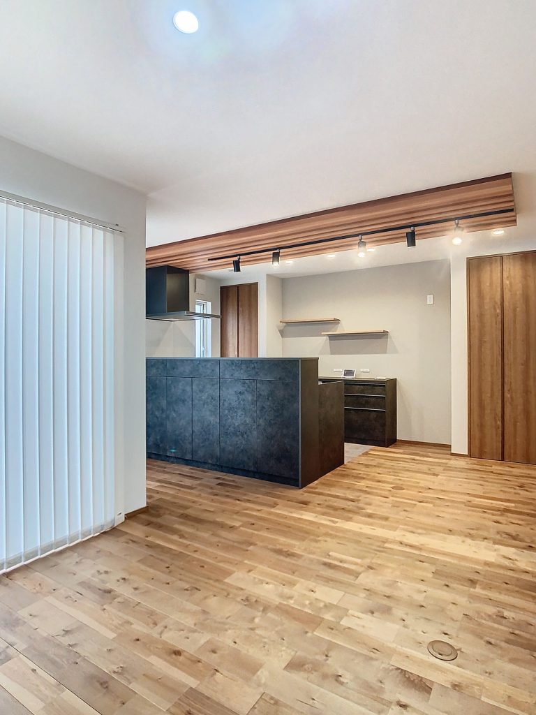 キッチン・ダイニングテーブルエリアの天井を下げ、木目調のアクセントクロスを施したLDK。これにより、食事のひとときに特別な雰囲気が演出されます。また、木の温もりを感じる無垢床との相性も抜群です!