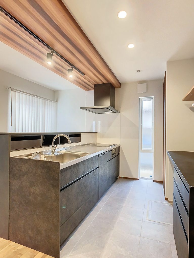 キッチンそのものを黒くし、天井の一部を木目仕上げにする人気のある「木目×ブラック」コーディネートは、ナチュラルな木目と引き締め効果のあるブラックが組み合わさり、おしゃれな空間に!