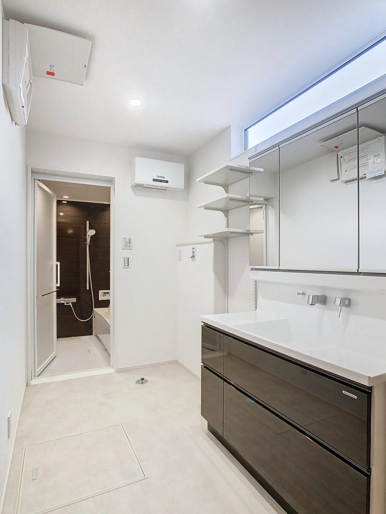 キッチン裏に配置した広めの洗面脱衣室。水回り空間を直線配置することで、シンプルな家事導線を確保し、家事の効率化を図った間取りになっています。