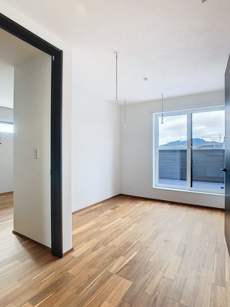二面採光があり、風通しも良く、過ごしやすい6.5帖の寝室は、大型のベッドも置ける広さがあります。ライトグレーの壁紙は、様々なインテリアテイストに合わせやすく、おしゃれになります。