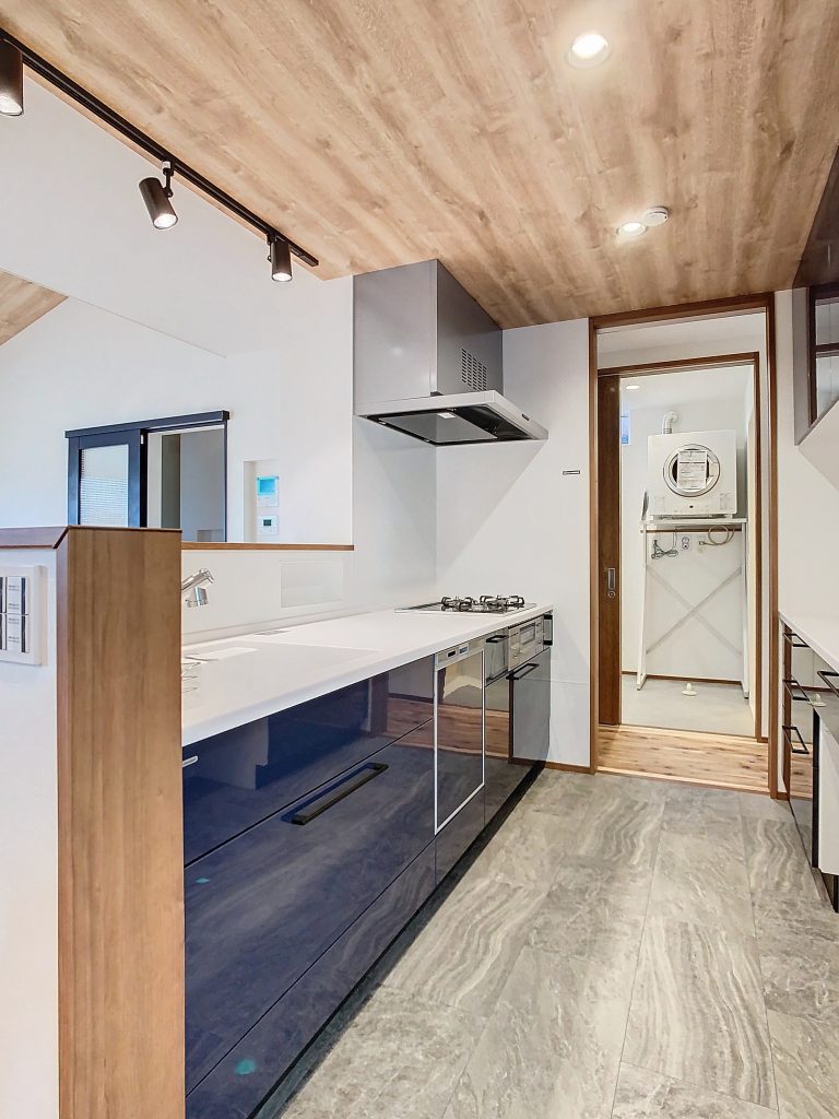 キッチンの折り下げ天井に木目調のアクセントクロスを採用することで、お洒落度が一層高まり、インテリア空間にアクセントが加わります。また、この木目調の天井は、ブルーのキッチンとも相性が良いです。