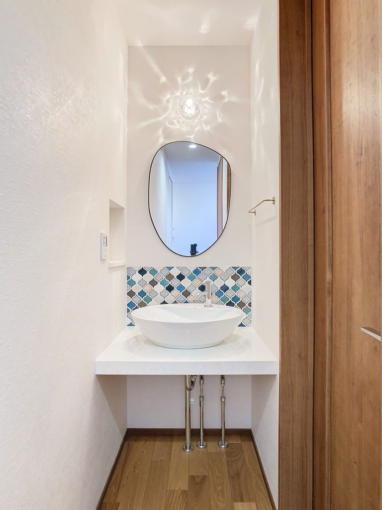 2階に設けた「セカンド洗面台」はオープンタイプで、可愛らしいタイルを使用し、モダンな洗面ボウルやおしゃれな鏡、照明などが配置されています。この空間で身支度を整えることで、お気に入りのアイテムに囲まれた心地よい時間を過ごすことができます。