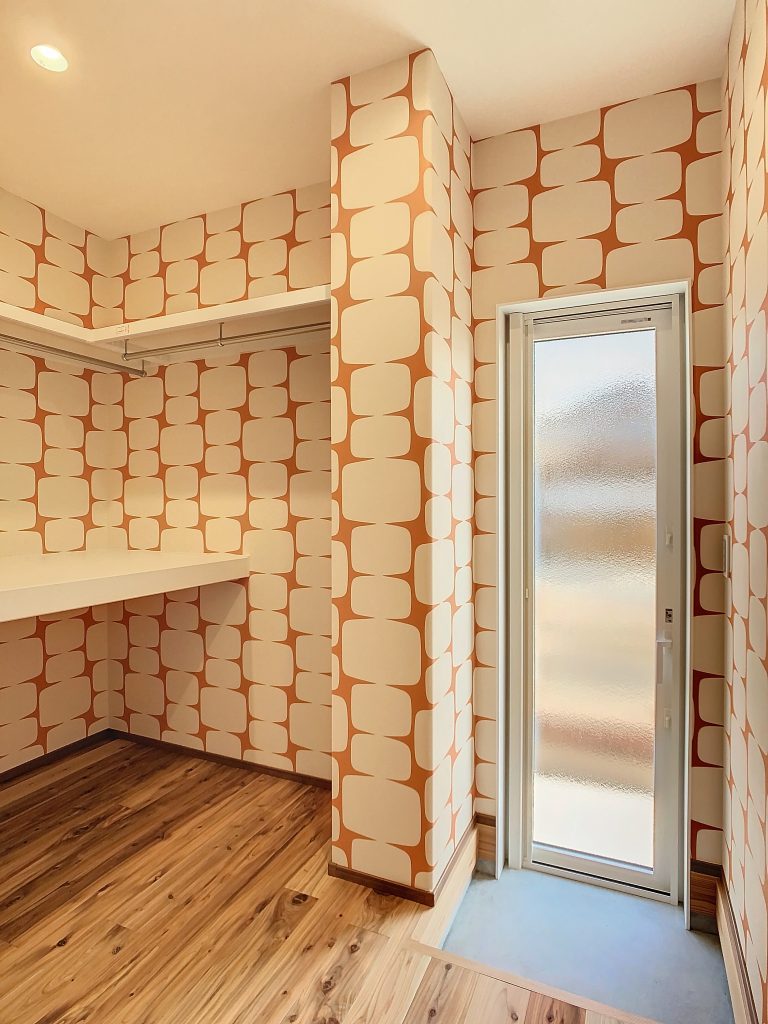 ファミリークローゼットに勝手口を設けました。家族が泥や雨で汚れて帰ってきても、勝手口から直接服を脱いで着替えられ、リビングを通らずに家に入れます。これにより、汚れた上着が家の中に放置されることがなくなります。