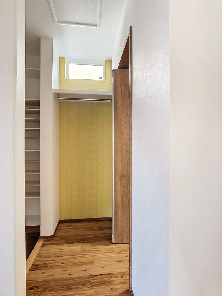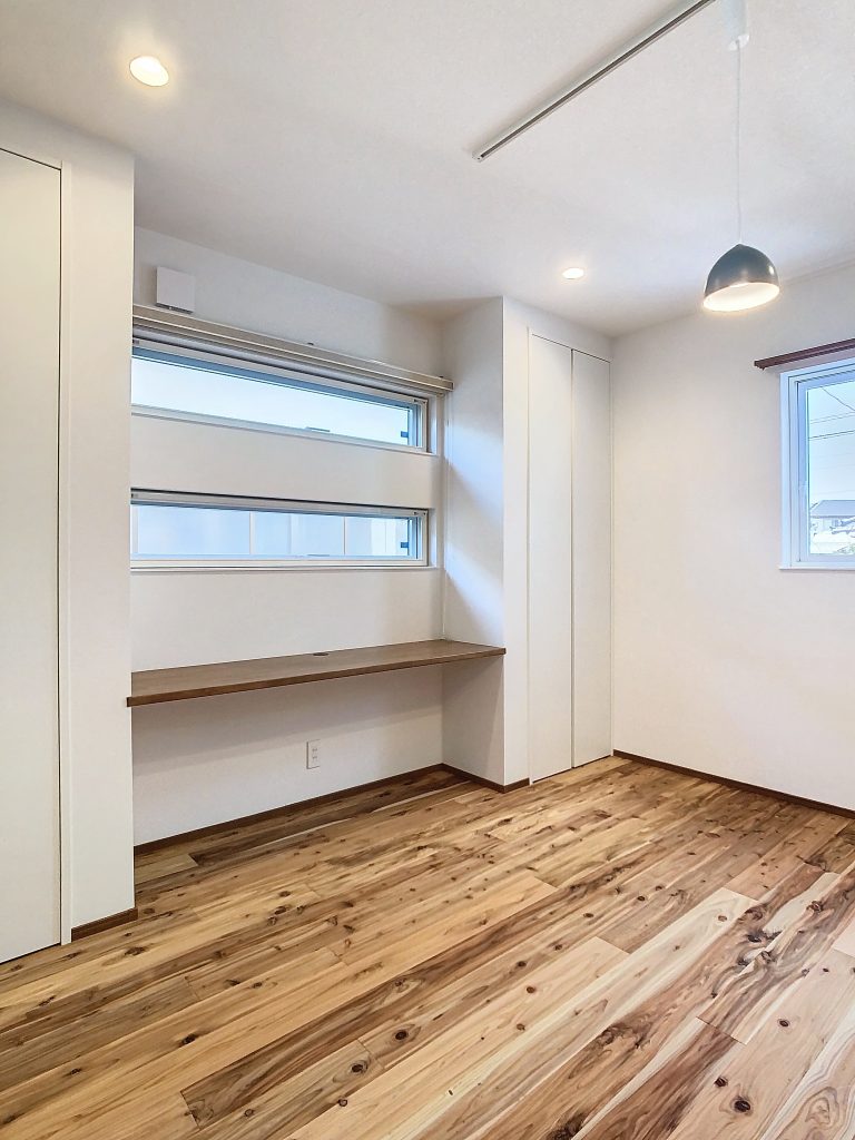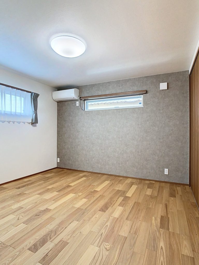 グレーのアクセントクロスがポイントの寝室は、壁面収納を施しており、2つにセパレートしているのでご夫婦で便利に使えます。