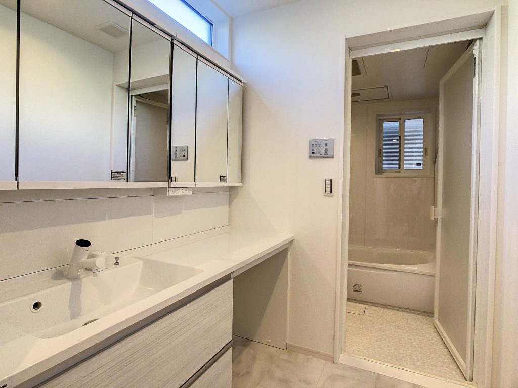 毎朝気分を上げてくれるおしゃれな洗面化粧台で、メイクスペースも充実